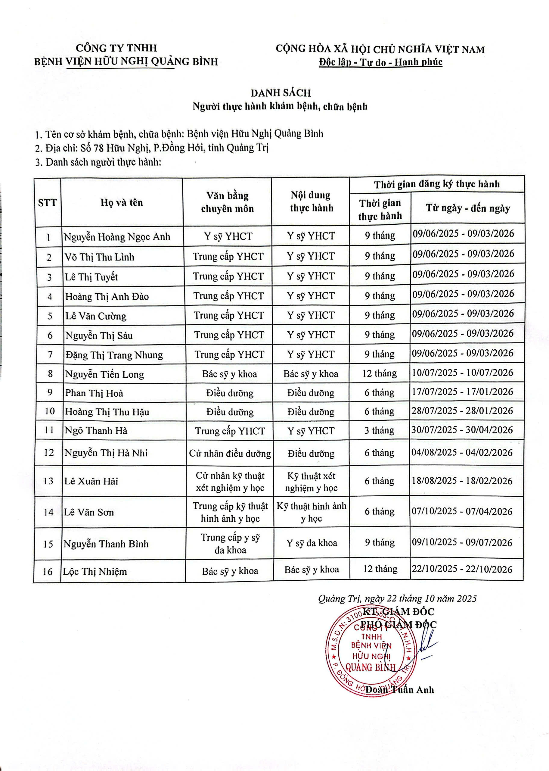 DANH SÁCH NGƯỜI THỰC HÀNH KHÁM BỆNH, CHỮA BỆNH TẠI CƠ SỞ TÍNH TỚI THÁNG 10/2025